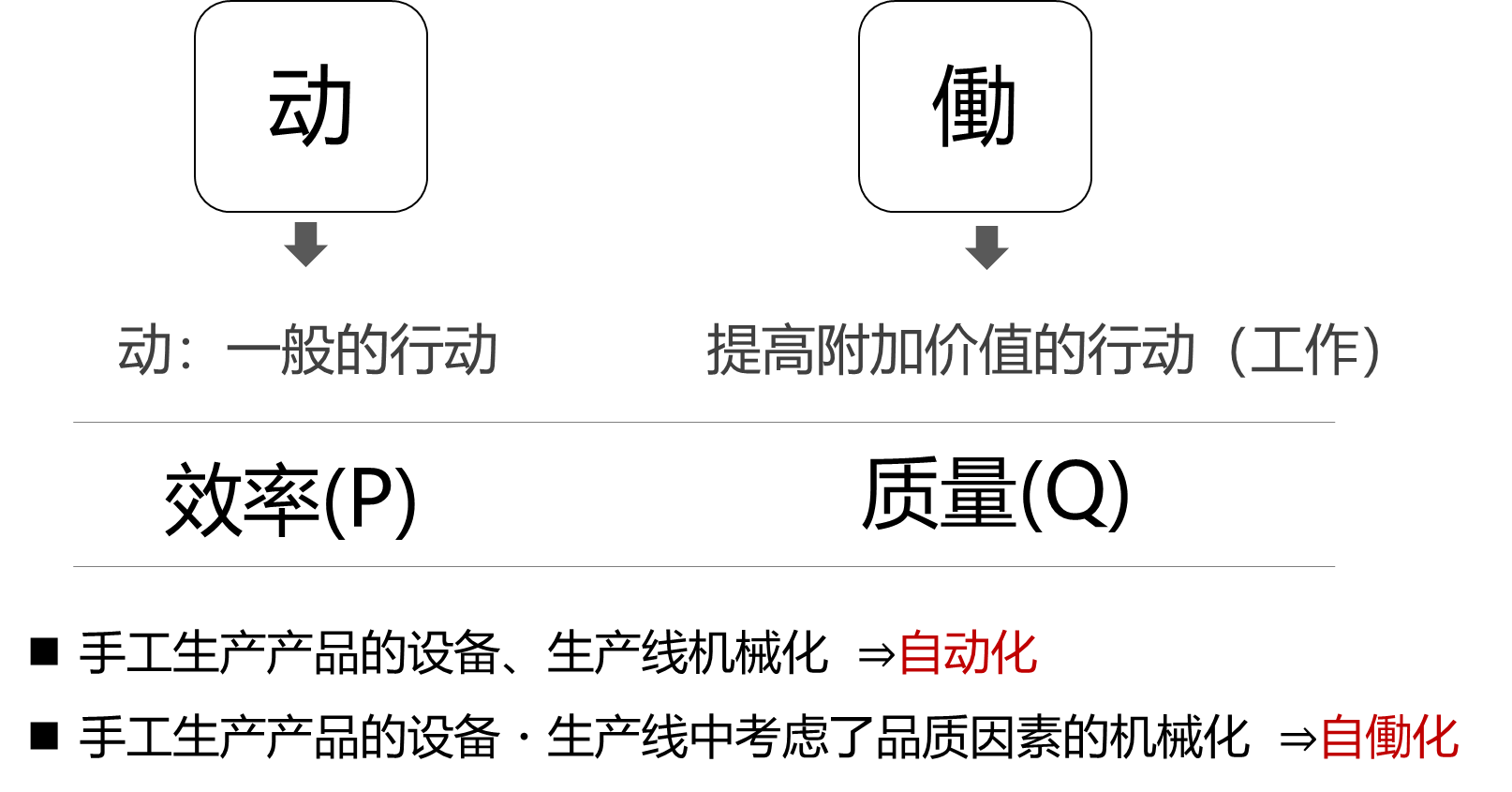 省人化 | 将人和机械的工作分开 安东原理 再发防止 | 不做设备看守人,使设备像人一样工作的思路,即使异常发生,因为机械可以自动停止,不必有人守在旁边监视机械,提高作业效率 可在设备运转时等待的时间里去做其它工序的工作,从而实现“省人化” |