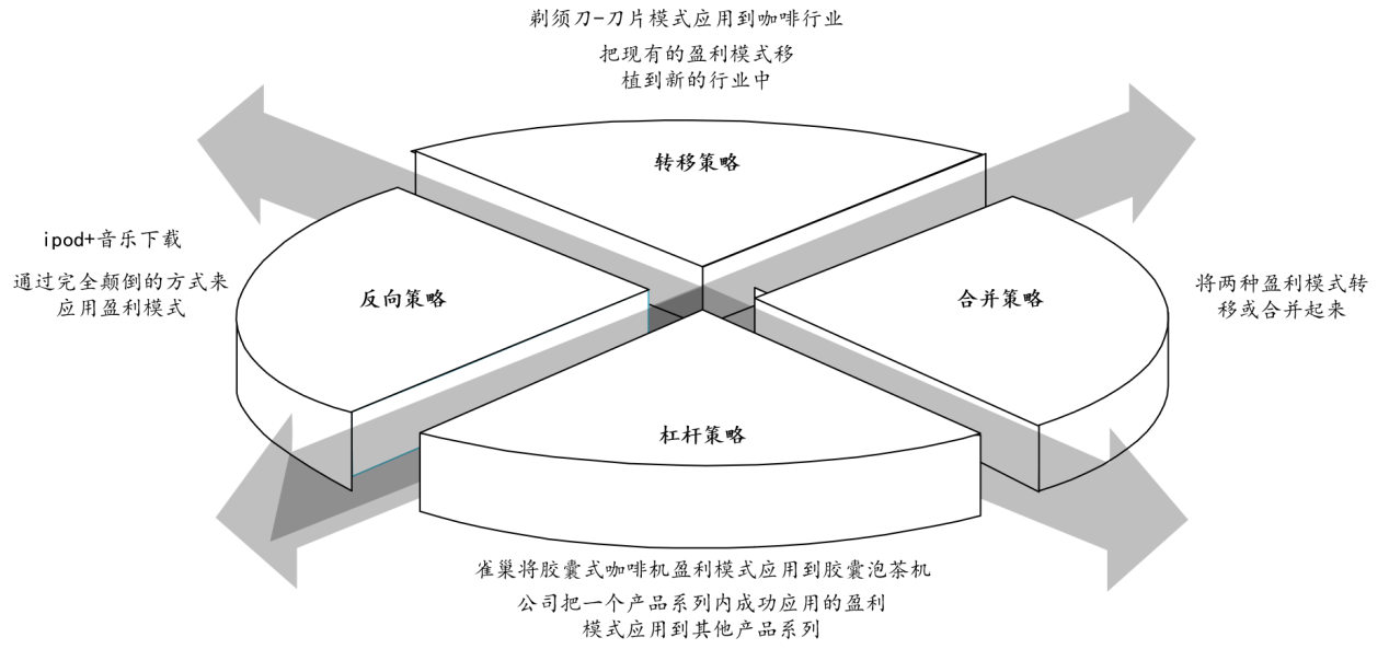 盈利模式还要考虑盈利模式应用策略问题,盈利模式应用策略有很多,包括转移策略、合并策略、杠杆策略、反向策略等(如图2-50所示),其中“转移策略”应用是最为人们熟知的一种盈利模式应用策略,以下通过“剃须刀-刀片模式”进行说明。