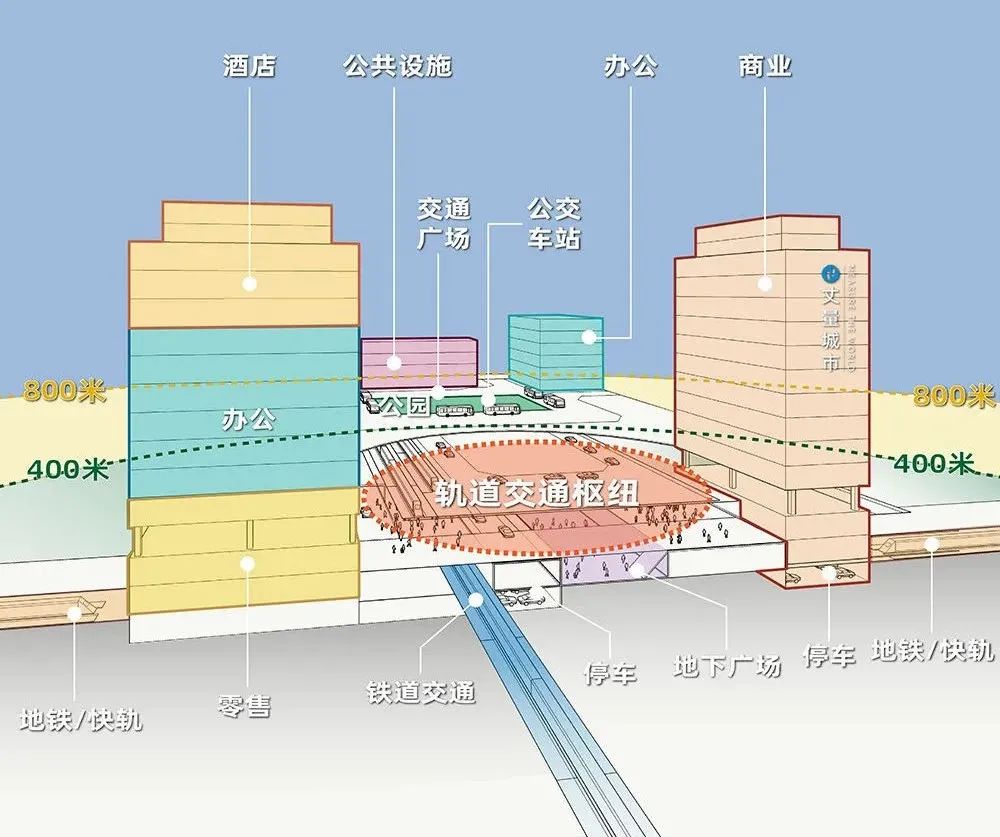 一般来说,传统TOD开发模式即“以公共交通为导向”的开发模式,主要是指以地铁、公交干线等枢纽站点为中心,以400~800米(5~10分钟步行路程)为半径,将出行、居住、工作、购物、 休闲、娱乐等功能集于一体,形成高效、集约、舒适、绿色的城市空间。