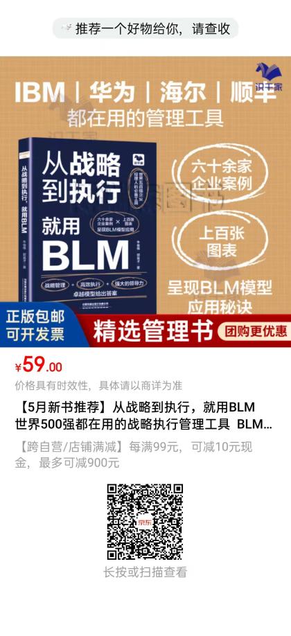 《从战略到执行 就用BLM》这是一本详细介绍如何更好使用BLM工具的管理书籍。BLM业务领先模型是IBM公司和哈佛商学院共创的从战略到执行的管理工具。时至今日,世界五百强绝大多数企业都引入了BLM模型,包括华为、海尔、顺丰、腾讯、中国电信等众多的中国企业,都将BLM模型作为最重要的经营管理工具。本书共七章,聚焦于BLM的核心框架,深入浅出地介绍了BLM模型的起源、各模块的核心内容、管理思想、应用场景、工具应用特点等。除了深入研究中外优秀企业的成功实践,受益于亲身为六十余家企业提供管理咨询服务中的实战经验,我们总结提炼了重多的经营管理方法论、图表、模板、工具清单等,可以更大限度帮助读者拨云见日,更加高效地掌握该工具。