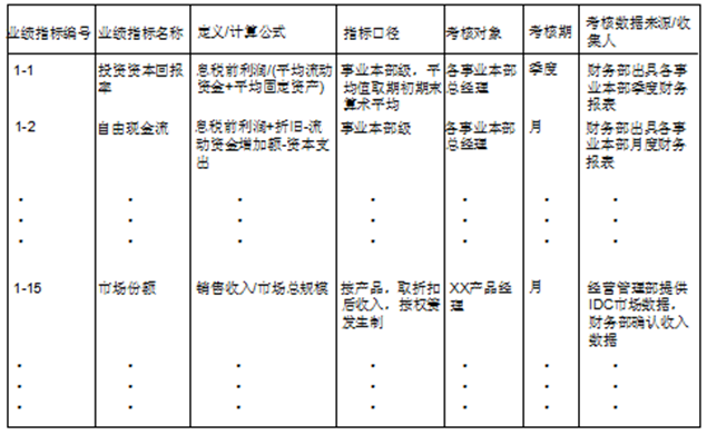 在绩效管理实施过程中,为保证所有人员对于同一个指标的理解相同,公司要建立指标辞典,统一解释,否则,对于同一个指标的理解会产生歧义。指标辞典示例如表9-13所示。