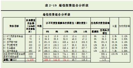 现以700万元投资金额为例,若想如期达成所拟定的六项财务目标,那么最佳的资金配置如表3.19“最佳投资组合分析表”所示。