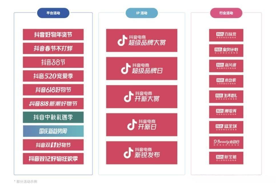 营销活动主要是平台活动,包括品牌大促、节日活动和与品牌一起打造的专场活动。主题活动是平台提供的各种主旨性活动,意在为商家提供借助平台资源,开展相关品牌活动的机会,是商家可以借助平台资源实现销量爆发增长的引擎。商家可以匹配品牌宣发、新品发布、大促爆发等不同经营目标,借助平台资源实现快速成长。其中,包括平台的日常活动和商家自建的一些活动。图4-76列举了抖音平台的一些官方活动。