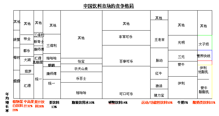 饮料的本质是“解渴+营养”的组合,无非是两者的比例配比不同。100%解渴的有纯净水、可口可乐、雪碧等;80%解渴+20%营养的有绿茶、橙汁饮品、凉茶等;50%解渴+50%营养的有椰汁、乳饮料、维生素饮料等;20%解渴+80%营养的有100%果汁、高端矿泉水、蓝莓汁等。按照这个配比去看饮料产品的消费认知细分,才能接近消费者的使用价值,而不是产品自身的属性。