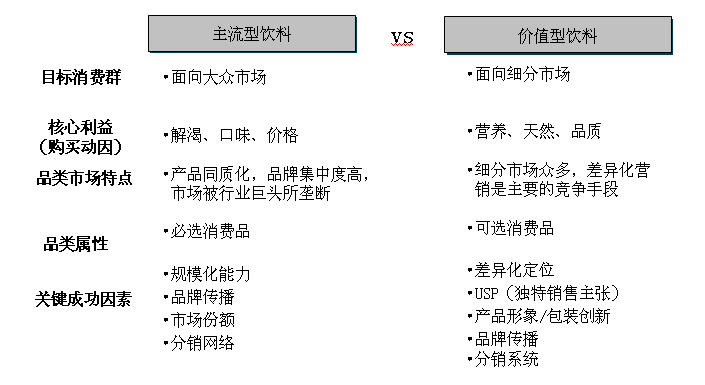 需要提醒的是价值型饮料的细分问题,细分不是按消费者年龄、收入和职业进行的细分,而是根据口味与消费观念进行细分,也就是产品概念及诉求可以引导的。以中国人目前的可支配收入水平,饮料的价格已经不是一个购买障碍,产品的需求动机才是关键。