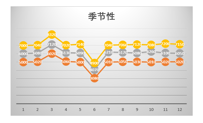 季节性是在一个时段内,每个相同周期内都会不断重复地出现增减变化。比如年度数据,过去十年的销售历史数据中,每年的三月就会处于销售的高峰,年年如此,那么这就是季节性的一种表现。一个典型的例子就是雪糕总是在夏季销量大增。季节性只是一个称呼,并非说特定季节,必然用于年数据上。同样,一年52周的销售数据中,每周的周三销售数据都是处于低谷的,这个也可以称为受到季节性的影响。这种影响既可以是自然的,也可以是人为力量造成的。