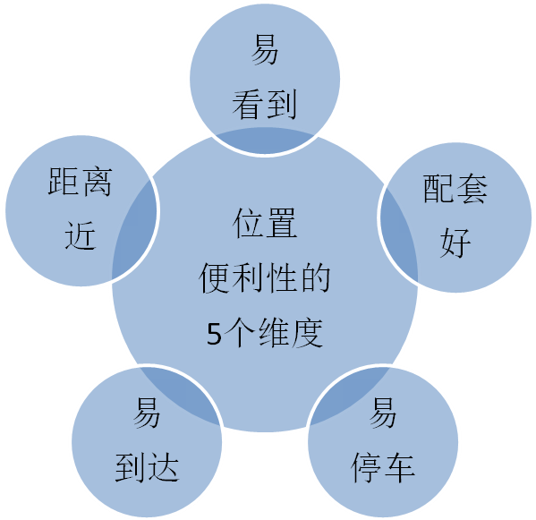 好位置,是不是它首先应该是便利的——便利性降低了顾客光临的成本——决策障碍小——抬腿就到——很快就到。5个维度包括:易看到、距离近、易到达、易停车、配套好。