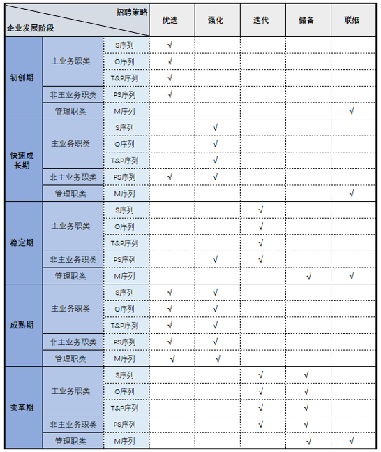 企业在不同发展阶段,管理职类、主业务职类、非主业务职类的各岗位序列(详见本书附录之表1“岗位职类”)所匹配的招聘策略与重点有所不同。如表3-1所示。