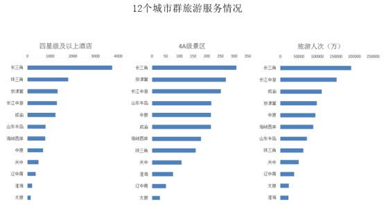 从商务发展配套看,长三角、珠三角、京津冀、长江中游和成渝城市群拥有较多的四星级以上酒店,商务性人流较大;从景区资源看,长三角、京津冀、长江中游、成渝、中原、山东半岛城市群拥有较强的休闲旅游资源;从旅游人流看,长三角、长中游、成渝城市群旅游人次突破10亿人次,旅游出行和消费的意愿较强。