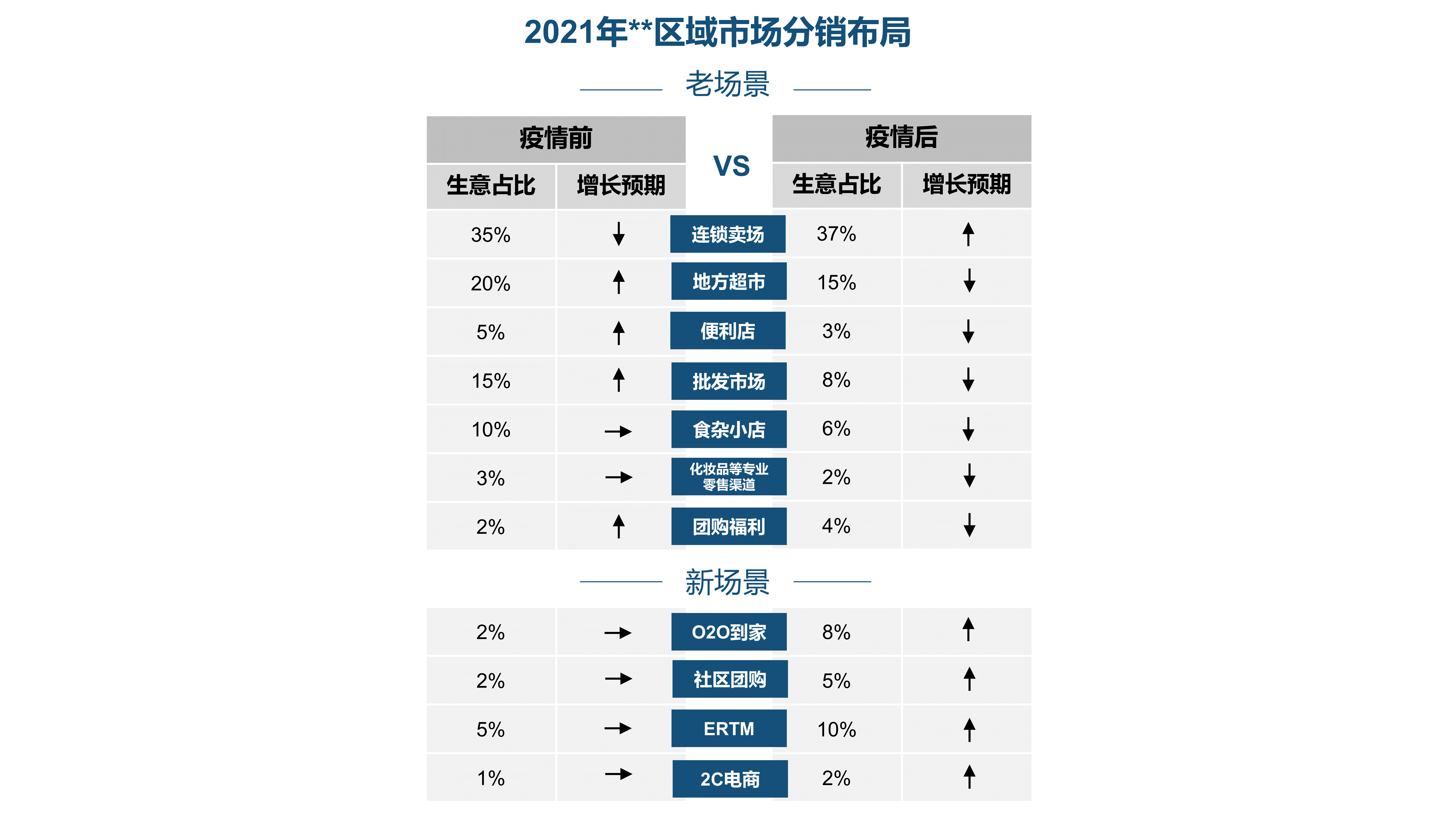 调整渠道预期,重新布局思考!根据年初的生意计划,老场景占比90%以上,而新场景仅仅贡献10%。没有疫情,连锁卖场应该会延续前几年的趋势继续惯性微跌。
