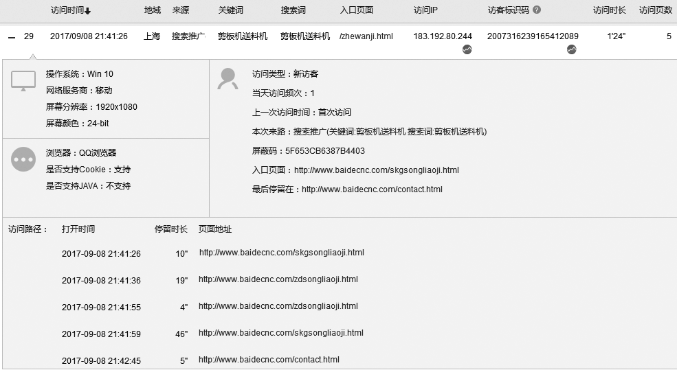 我们按从上到下,从左到右的顺序解读这些数据:该访客是2017年9月8号21点41分26秒,通过百度搜索“剪板机送料机”后,点击广告进入这家企业网站,对方的IP地址是183.192.80.244(系统正是通过此IP确定他所处地域是上海),访客标识码是200731……(这个标识码不是该访客的实际设备ID,所有的物理上网设备都有唯一的设备ID,按百度的说法是根据设备ID和其他参数设定的唯一标识码,下次如果该访客用同一设备再进来时,此标识码不变),他在网站上停留了1分24秒,看了5页。