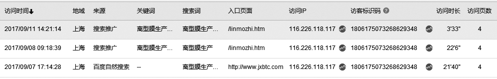 该访客于2017年9月7号通过自然搜索“离型膜生产厂家”,第一次访问网站,看了4页,花了21分40秒;第二次是9月8号通过搜索“离型膜生产”,点击付费搜索推广,看了4页,花了22分6秒;第三次前面已分析。也许有读者会说这三次访问也有可能来自某个竞争对手,他想研究一下你的广告和网站。确实有这个可能,如果该访客这么认真地看过网站还没有咨询,我们肯定会屏蔽掉他,也会怀疑对方是同行。而事实是他在第二次访问时,打电话咨询了我们。是我们是添力公司接到的电话,而不是这家离型膜厂,因为我们为该企业提供了全外包的线上营销服务,有兴趣的读者可以看这家企业的成功案例——本书第八章第六节。