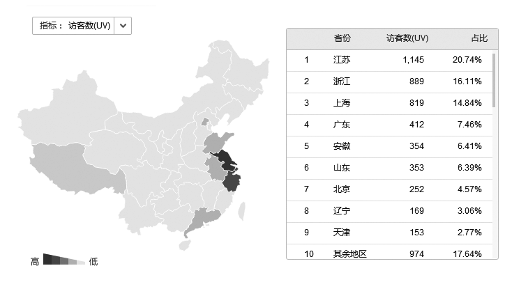 【地域分布】可以告诉你某时间段内哪个地区的访问量最多,通过对地区数据的分析,可以指导我们在不同区域广告预算有所不同。如图6-8所示,某账户一个月的全国各地区访客数排序。不能有地图