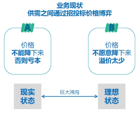 在最低价中标的背景之下,供应商辛辛苦苦准备的标书,最终未能中标,无外乎于“投标价格太高”。这种价格高,主要有两方面原因,一是价格不能降下来,否则供应商会亏损;二是价格不愿意降下来,因为供应商获得的溢价太少。对于采购商而言,却因为最低价选择不匹配供应商,合适的供应商被挡在门外,双方之间形成了双输局面。