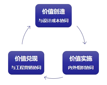 我们把全价值链分为三个阶段,分别是价值创造、价值实施、价值兑现。前端由设计成本部门协同,形成价值创造,即做好产品定位;中端由采购部门内外组织协同,形成价值实施,即做好采购招标策划;后端由工程营销部门协同,形成价值兑现,即做好交付实施。