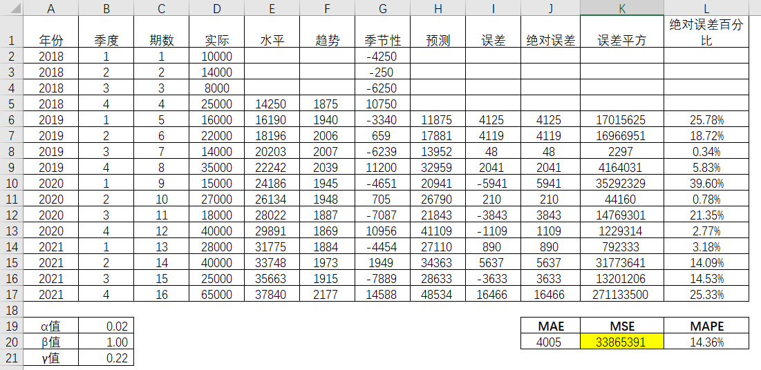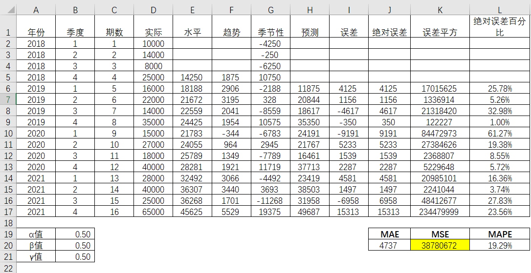 接着对绝对误差,误差平方,绝对误差百分比进行平均,得到对应的平均值,分别是MAE(Mean Absolute Error,平均绝对误差),MSE(Mean Squared Error,平均平方误差)以及MAPE(Mean Absolute Percentage Error, 平均绝对百分比误差)。并且相应的三个参数α,β和γ分别是0.5,0.5和0.5。由此得出的MAE,MSE和MAPE值分别为4737,38780672和19.29%。