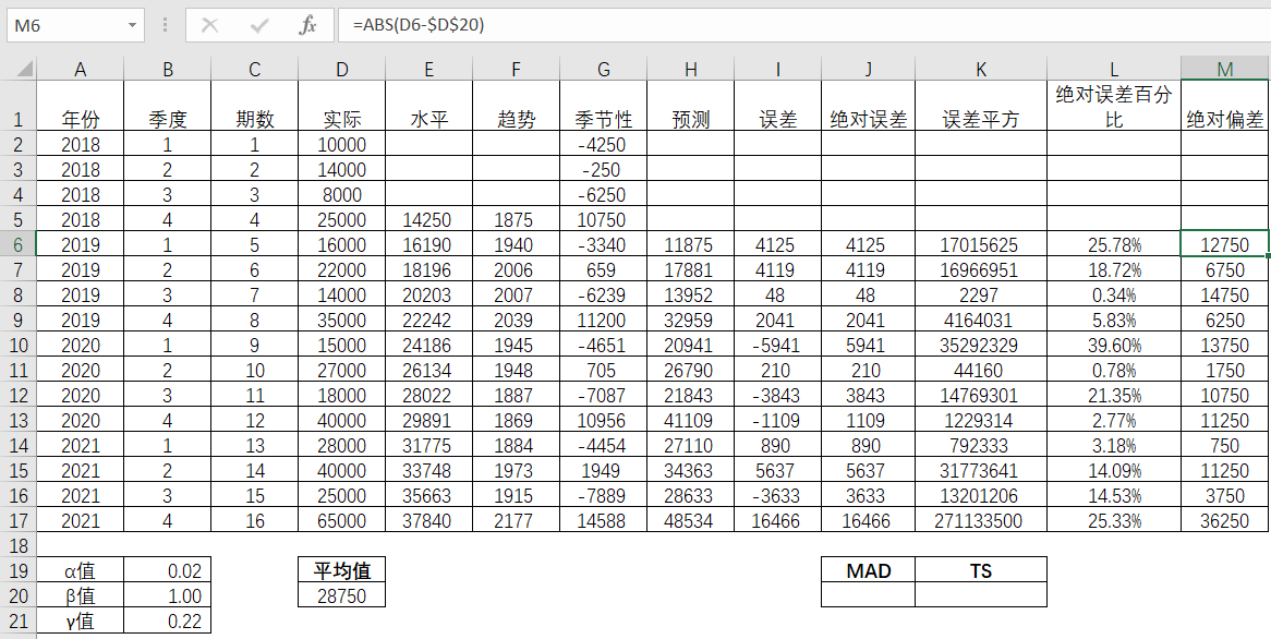 接着计算各期的绝对偏差值。