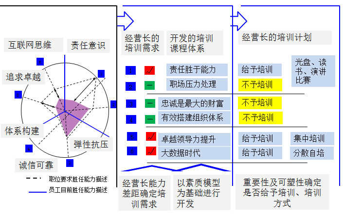 (3)汇总优先顺序,获得经营长的培训需求。有针对性地为每位经营长制定胜任素质能力培养发展计划,突出培训重点,做到有的放矢,这不仅杜绝不合理的培训开支,更提高了培训的效率,从而在提升经营长的个体能力的同时,提升了企业的经营能力。