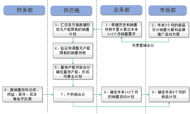 产供销会议要明确的是未来1个月和滚动2个月的常规品销售预测和新产品月度销售计划。由销售部运营负责人统筹,通过对上个月实际销售与预测数据的对比分析,以及对新产品和活动等的销售计划进行再一次回顾与确认。对上述两个数据资料重新与产品线销售负责人确认是否有计划做进一步扩大销售或有新的市场动向,是否会引起需求量的新增或下降,进而对产品的销售预测做全面的调整。它最终的要求是向产供销会议提供一份可参考的、比较可靠的,未来1个月和滚动2个月的常规品销售预测和新产品月度分解计划。