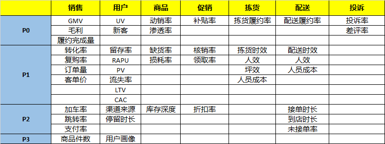 下一步,我们需要将数据维度池区分级别,暂时用P0、P1、P2、P3来代替重要优先级,P0级数据直接决定业务业绩,P1级数据直接体现业务健康度,P2、P3级数据直接反映精细化策略应用效果。如表2-1所示。