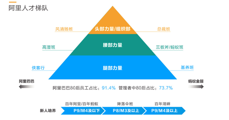 阿里巴巴的人才梯队建设:人才梯队氛围头部力量、腰部力量和腿部力量分别对应基层、中层和高层管理者,对这些员工的培训投入非常聚焦、重视。培训班的讲师一般都是副总裁级别或者骨灰级老员工,甚至是合伙人。许多一线员工和马云、彭蕾、井贤栋、逍遥子等人接触,并非是以员工和老板的身份,而是学生与老师的身份。据了解,阿里巴巴内部还有马云亲自当班主任的“风清扬班”。如图2-1所示。