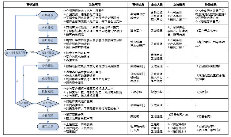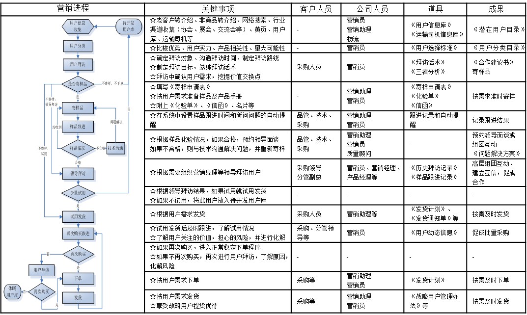 依据工业品营销六大步骤,结合企业的营销模式及营销策略,我们可以有针对性地制定出营销进程。营销进程要求我们把整个营销过程分解成若干重要的阶段性步骤,并列举出每一个步骤的关键事项、企业及客户各方的参与人员、所需的营销道具,以及需达成的重要目标及成果。