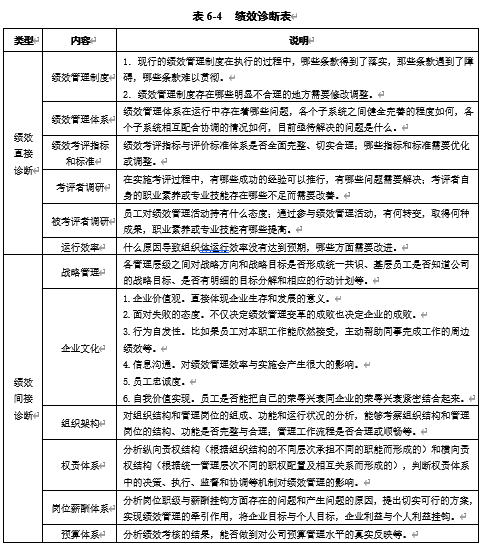 绩效直接诊断 | 绩效管理制度 | 1现行的绩效管理制度在执行的过程中,哪些条款得到了落实,那些条款遇到了障碍,哪些条款难以贯彻。 2绩效管理制度存在哪些明显不合理的地方需要修改调整。 |