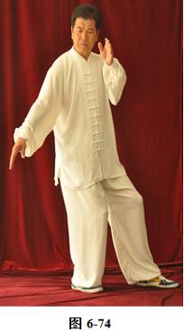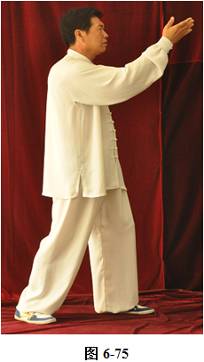 接上式,腰向右后侧旋拱,身体微微右转,右肘下沉,右掌走弧形下落至右胯侧旁,随下落随着手臂外旋转,手心渐渐翻转向上; 左掌随着身体右转向外旋翻,经胸前向右随之向左下经左膝向左胯侧旁,以半圆弧形搂至左胯侧旁,掌心向下;右腰上提,右掌随着身体前移,左脚向左外侧回拉半步,成左弓步,右掌向上经右耳旁向前拍出,手掌心斜向上(见图6-74至6-75)。