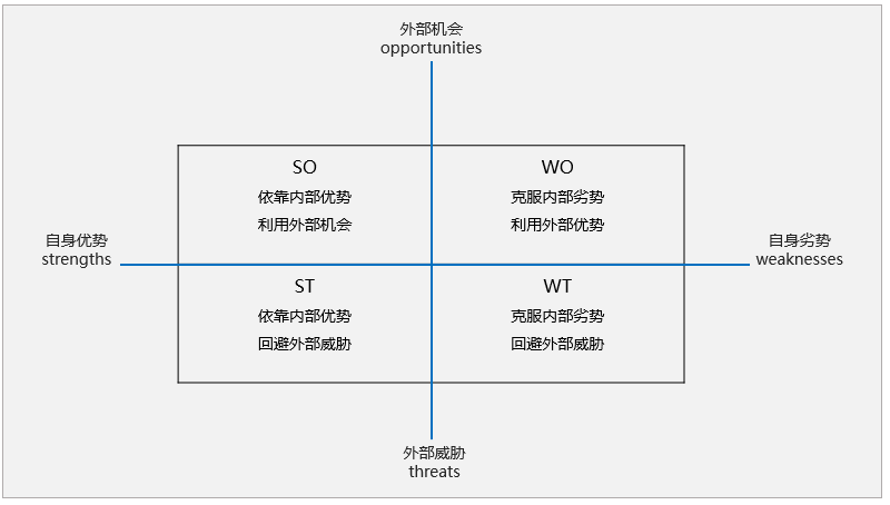 SWOT分析会对一个组织、项目或方案的优势、劣势、机会和威胁进行评估。在识别风险时,它会将内部产生的风险包含在内,从而拓宽识别风险的范围。首先,关注项目、组织或一般业务领域,识别出组织的优势和劣势;其次,找出组织优势可能为项目带来的机会,组织劣势可能造成的威胁,还可以分析组织优势能在多大程度上克服威胁,组织劣势是否会妨碍机会的产生。如图7-8所示。