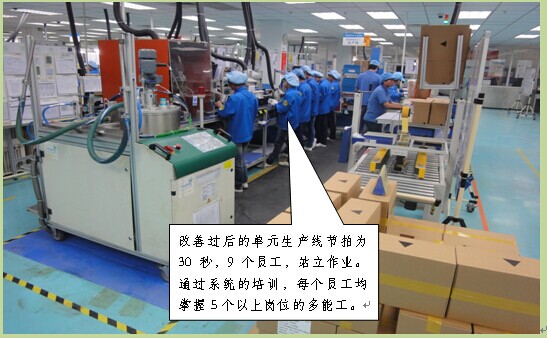 矩形标注: 改善过后的单元生产线节拍为30秒,9个员工,站立作业。通过系统的培训,每个员工均掌握5个以上岗位的多能工。