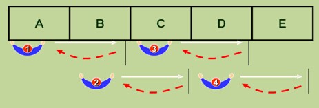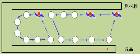 操作员的数量比工位数量少一个,每位操作员负责两个工位的机器操作,在一个工位上生产完成以后就移动到下一个工位,然后再回到前一个工位,轮流交替生产,如图2-9所示。