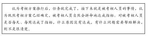 :也就是绩效考核还要抓工序的交接,还要抓产品的清尾。因为尾数不解决,货就给不了客户,最后也没有办法算你的业绩。所以人力资源部做考核的人,他们是不会想这些的,他们的思想是不会往这个方面延伸的。所以为什么很多企业一搞考核管理人员就反对,原因就在这里。但是人力资源经理可能会觉得考核是必需的,但他仅仅把它当作一个管控动作,他不知道其实搞绩效考核牵扯到非常多的细节化的现场改善,甚至需要对生产过程进行梳理,要做大量的基础工作。实际上,单独由人力资源经理来做绩效考核是做不好的。