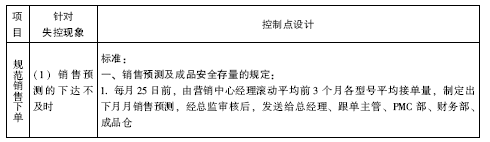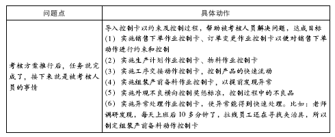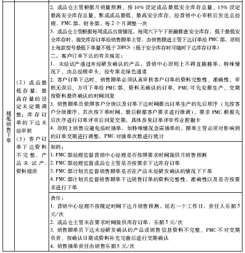 :针对这些问题,项目组导入控制卡以约束及控制过程,帮助被考核人员解决问题,达成目标。比如实施销售下单作业控制卡,如表1-12所示。