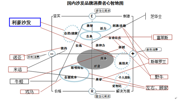 基于目前沙发行业的技术、自然、定制化的定位空间未被占领,考虑到生产成本的约束,定制化暂不考虑,于是,我们建议利豪沙发品牌定位为:健康、科技和舒适。