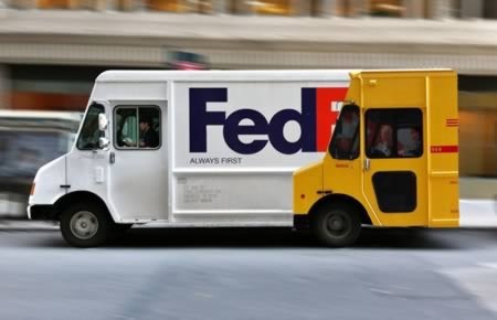 Fedex 和DHL是两家竞争的物流公司。Fedex的运输车是白色的,又一次,他们把全国的白色车车身上喷涂了这图案——后半部分涂成DHL黄车的模样,开在公路上,很容易被误认为是两辆车先后而行,车厢上的文字写到: “Fedex 始终比DHL 快一步”的广告”。