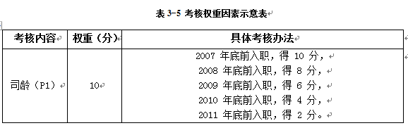 以激励对象的司龄、职级、业绩三个因素作为考核得分的依据,计算出各对象的考核得分。具体考核权重因素如表3-5所示: