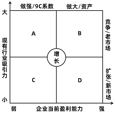 企业的长期使命是增长,9C矩阵以此为核心,选取两个要素,来衡量一家企业的经营态势,并根据不同的态势分别指出不同的战略方向。