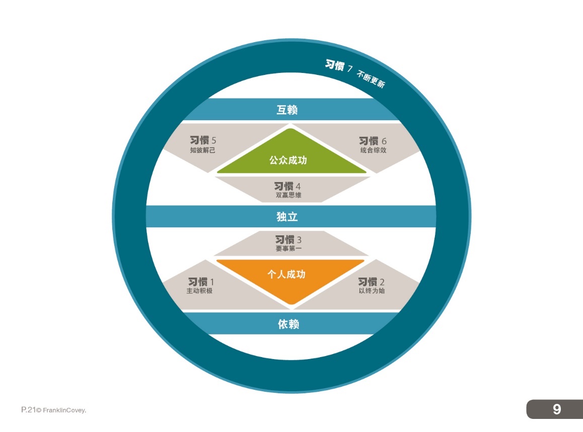比如《高效能人士的七个习惯》这门课程,整个课程都是围绕持续成熟模式图进行展开讲授的。个人成功有三个习惯,公众成功有三个习惯,还有一个不断更新的习惯能够实现个人成功和公众成功的螺旋式上升。当个人成功的习惯做好后就能完成依赖期到独立期的阶段跨越,当公众成功的习惯做好后就能完成独立期到互赖期的跨越。这七个习惯用一张图串起来,内容就没有那么散。如图7-6所示。