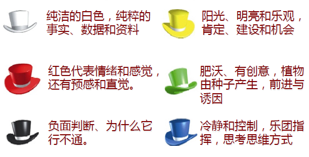 《六顶思考帽》这门课程,它用六顶帽子来代表不同的思考规则,不同颜色的帽子为组织思维提供了框架,思维变得更加集中,更加有组织性,更有创造性。如图7-7所示。