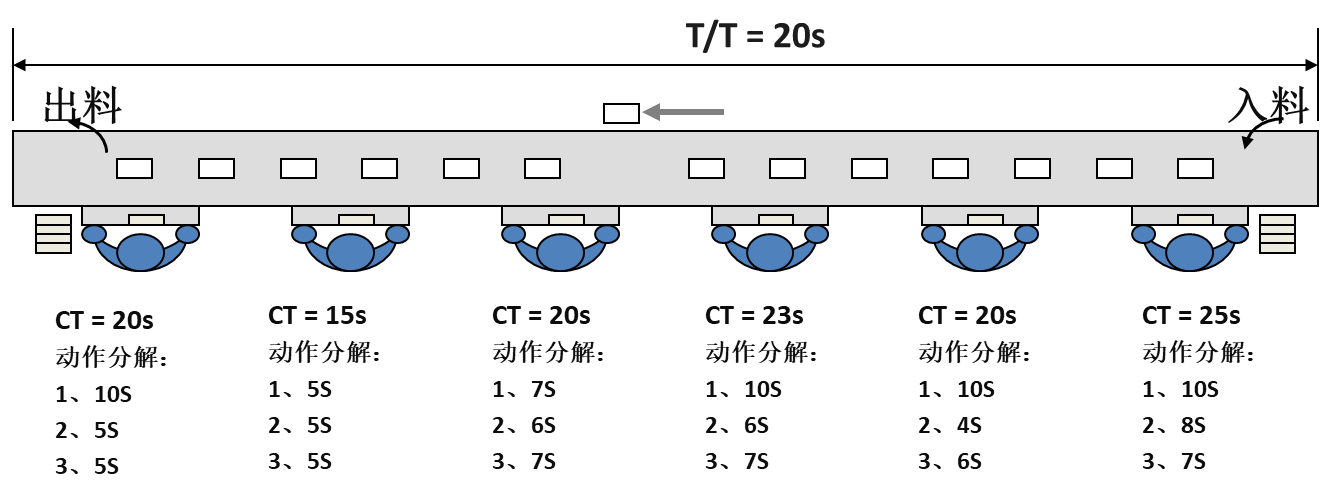 瓶颈工序指生产线所有工序中所用人均工时最长的工序,通常指一道工序,有时也指几道工序。例如:以下CT=25S的工序为瓶颈工序。