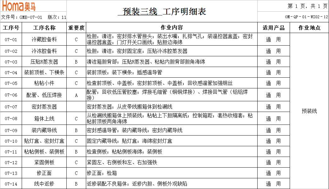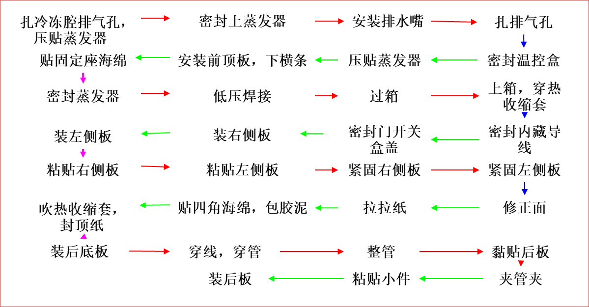 测量之前先要对每个工站作业进行动作单元拆分,拆分原则为可明显区分出起始点。例如:第一工站“放底盘泡沫”可拆分为:放底纸底盘组件;拔护套、放胶垫片3个/粘贴压缩机底部胶皮;放检验卡、条码。