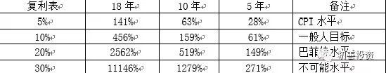 在此,笔者的重点不是复利,而是引用复利计算的收益率作为一个锚。如表3-1所示,141%的意思是假设复利为5%,那么18年后的收益率为141%,即投资10万元,18年后可以赚14.1万元。以此类推,271%的意思是30%的复利5年的收益率为271%。即使世界投资大师,其51年间(1965-2015年)的长期复合收益率也只有19.2%。