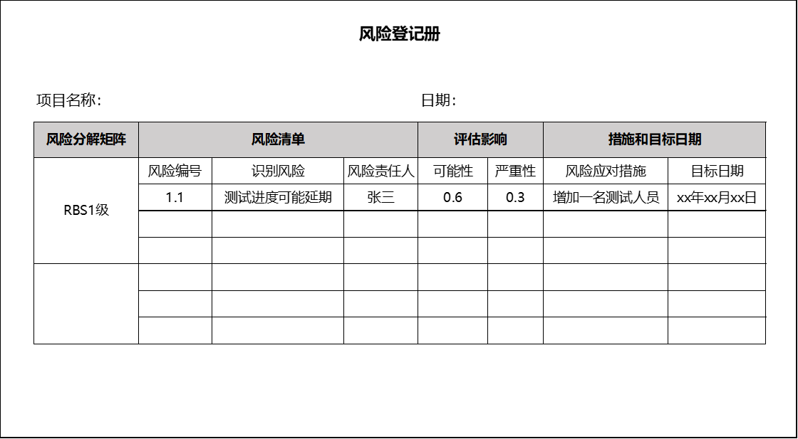 风险登记册是记录风险管理过程输出的存储文件。风险登记册中的信息可以包括相关管理风险的负责人,概率、影响、风险评分、计划的风险应对,以及用来获得关于单个风险的高层级理解的其他信息。风险登记册在整个项目期间不断更新。如表8-5所示。