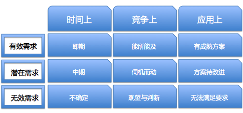 3)无效需求。客户的要求过高,或者对手的门槛过高,这都会导致看得见、摸不着的结局。值得注意的是,有一些无效需求随着行业整体或自己企业的进步,会转化为潜在需求的。