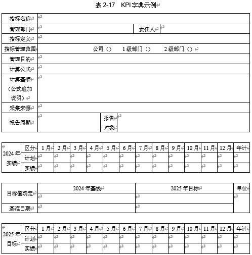 为了方便管理,确保每个员工都能正确理解公司制定的战略 KPI,可根据需要制定 KPI 字典。KPI 字典用于制定目标值和管理实际达成情况,模板如表 2-17 所示。