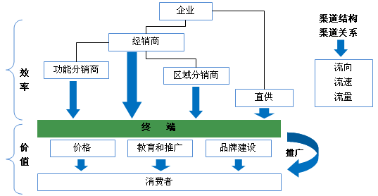 在国内,严重同质化的消费品市场得渠道得天下,娃哈哈依靠渠道力打败了产品力很强的可口可乐就是最好的说明。渠道和终端是上下游的关系,渠道的好坏以渠道到达终端的流向、流速、流量为衡量指标。终端的多元化和个性化反映到渠道,要求在渠道不断增加受控终端的数量,重视网络渠道的力量。