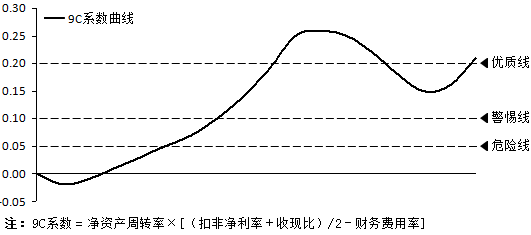 将企业各年度9C系数连接起来,成为一条线,这条线就是9C系数曲线,对这条曲线进行分析,即9C系数总览。如图2-5所示。