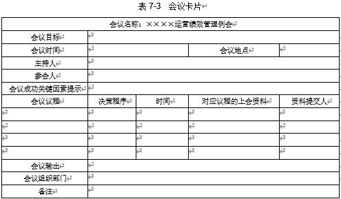 运营绩效数据分析报告、内控评估报告都需要在运营绩效管理例会上进行“晾晒”,各个运营绩效指标负责人要对自己所负责的指标达成情况进行说明,重点在于对未达标指标的分析及计划采取措施,由于大部分问题与计划在会前已经沟通过,会上主要做一个宣讲,个别问题还没有定论的需要在会上讨论与决策。会议由质量运营管理人员组织,为了保证会议开得更有效率,可以通过会议卡片来进行管理,如表 7-3 所示。