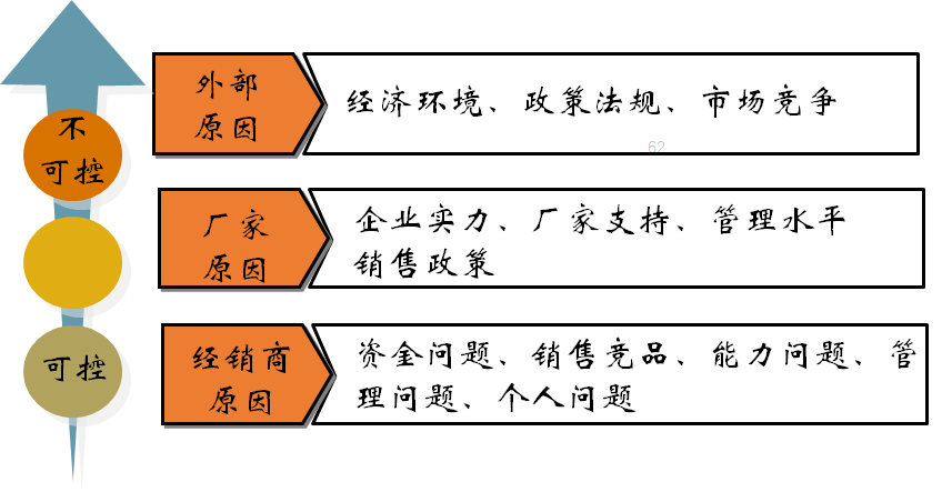 经销商本身的原因:资金问题、销售竞品、能力问题、管理问题、个人问题。