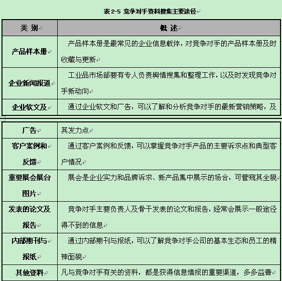 工作中不断积累,并不定期维护更新。正经对手资料搜集的主要途径如表2-5所示。